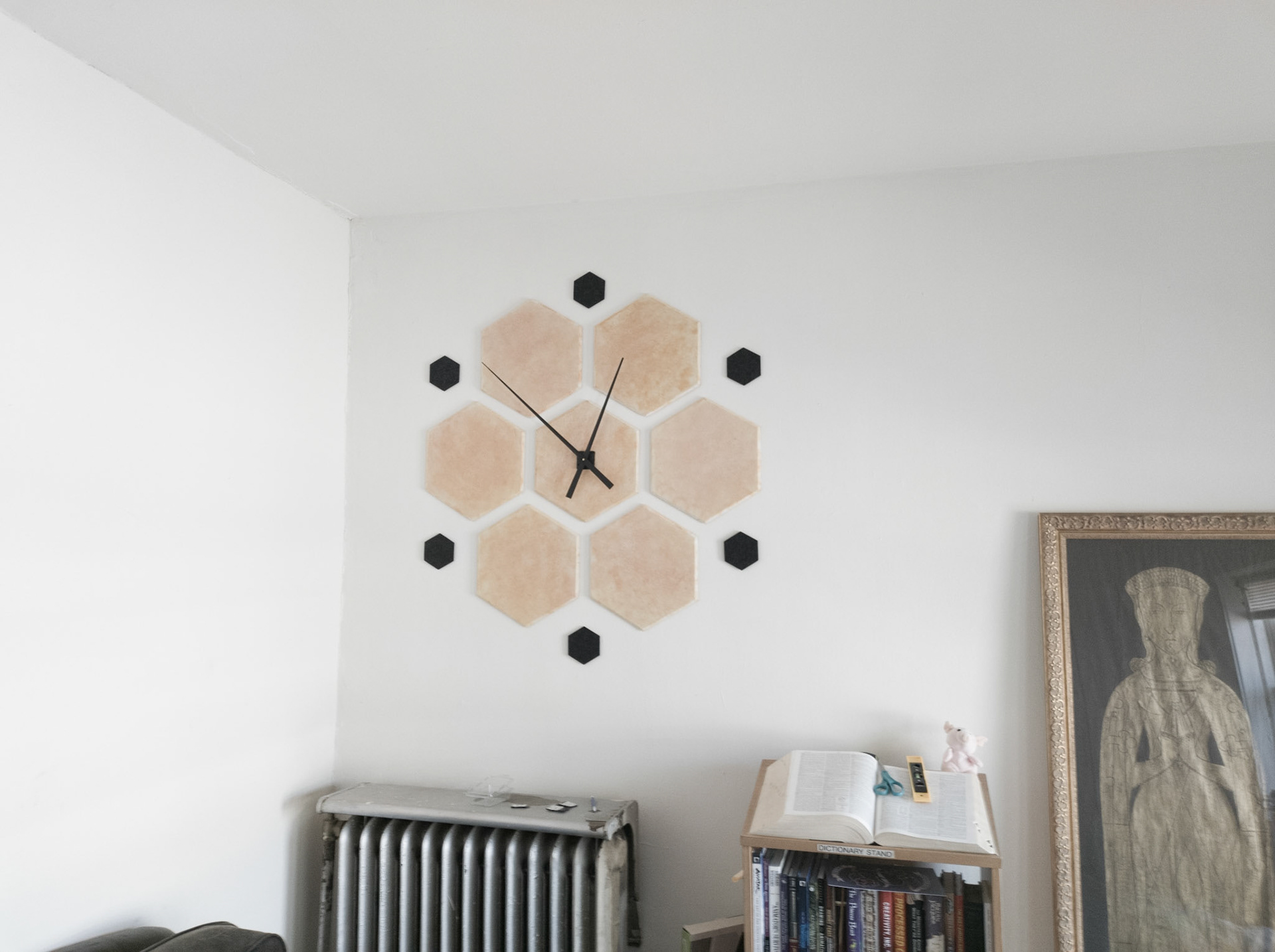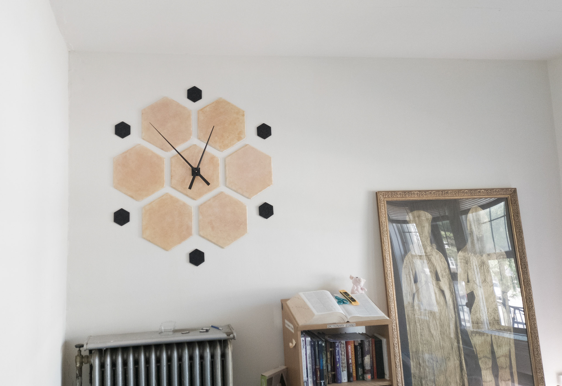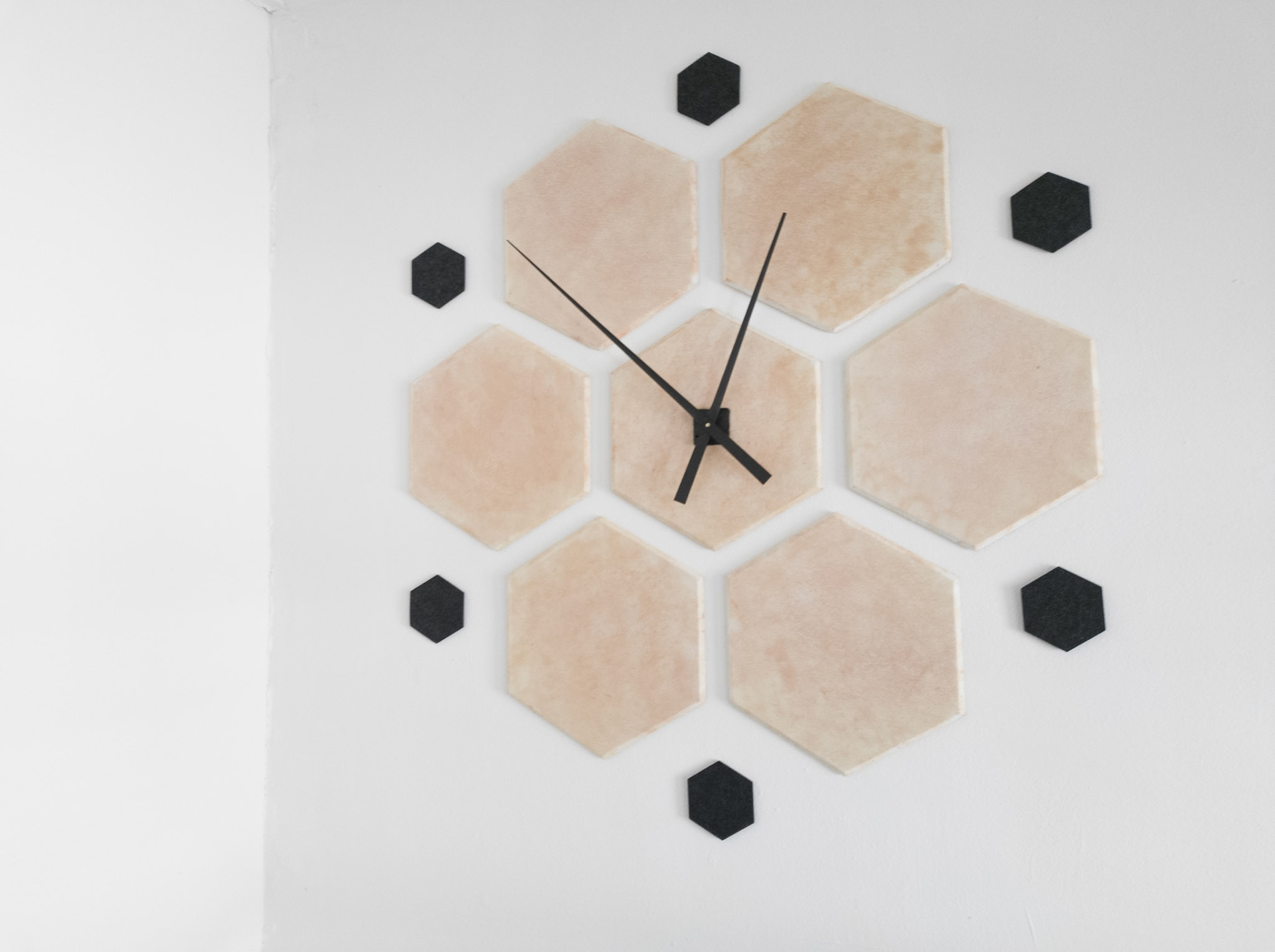 Sculpture installation. Large hexes are acoustic studio tiles spritzed with yellow and red dyes. Small black hexes are foam coasters. Quartz movement and hands from Klockit.